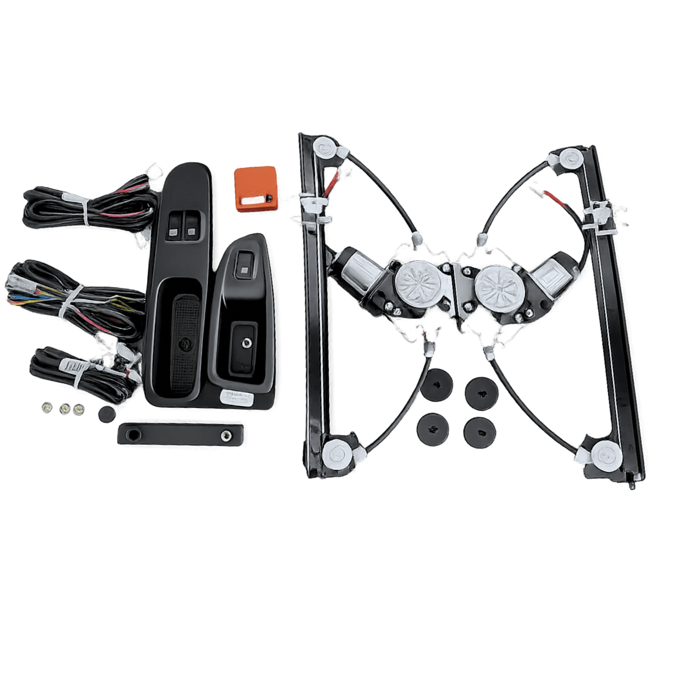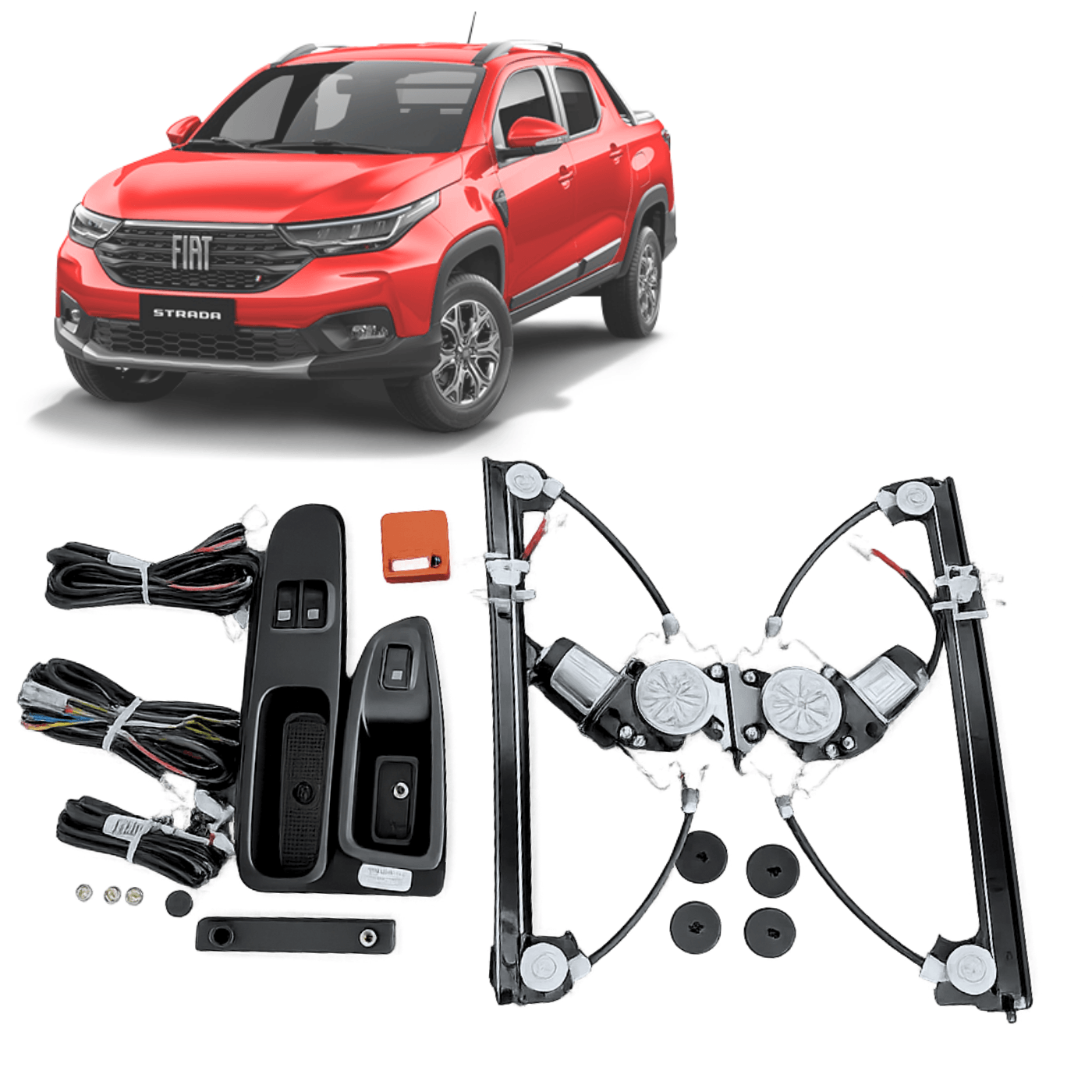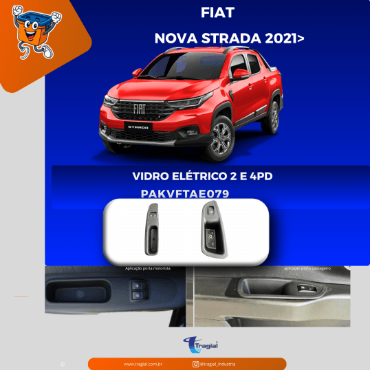 Sistema completo para automatização dos vidros dianteiros da Fiat Nova Strada 2021, disponível para versões 2 e 4 portas, com integração ao padrão original do veículo.